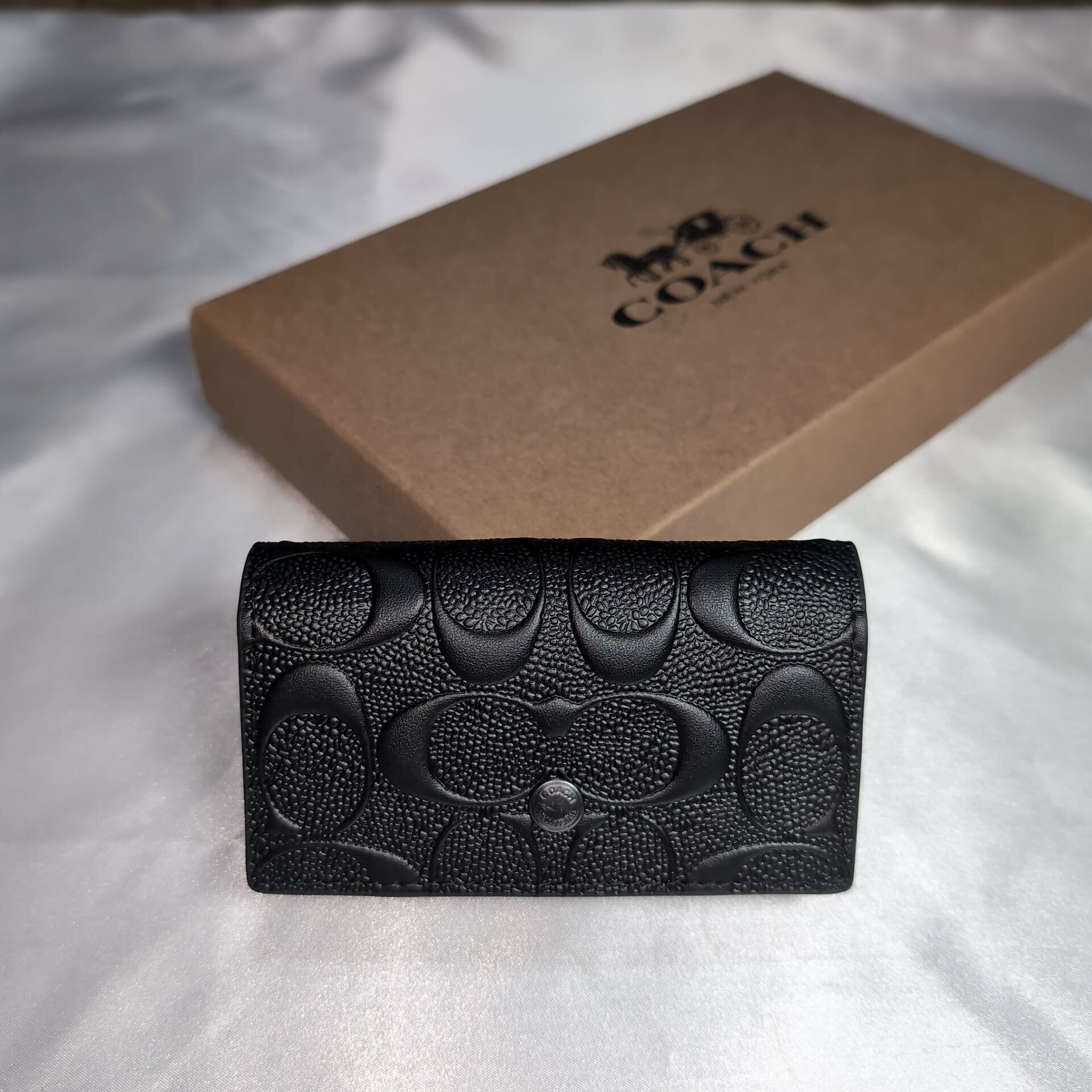 COACHのシグネチャーエンボス加工が施されており、ブラックのカラーがシンプルでありながらも高級感を演出しています。