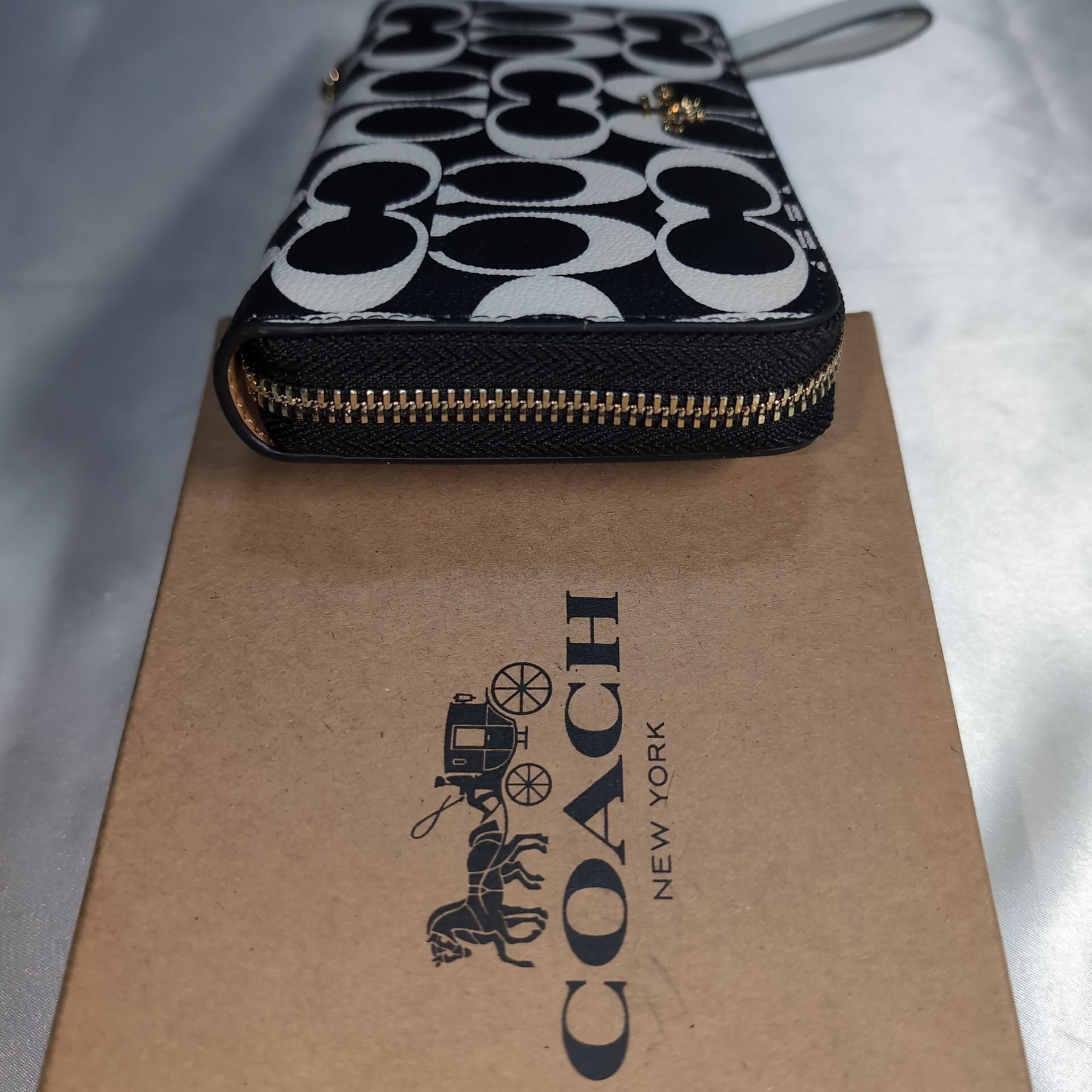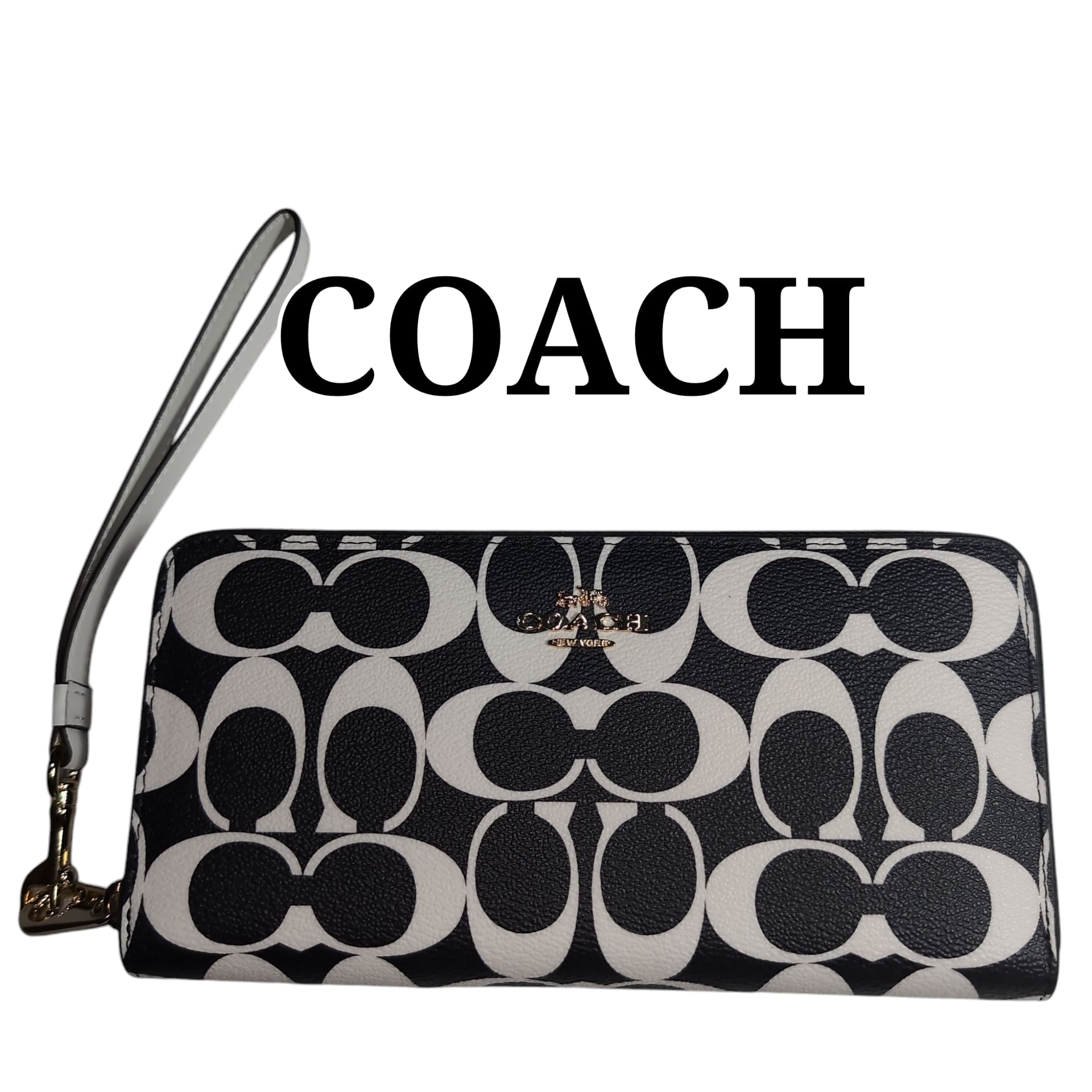 大人気ブランドCOACHのラウンドファスナー長財布、シグネチャーデザイン(ブラック×ホワイト)です!