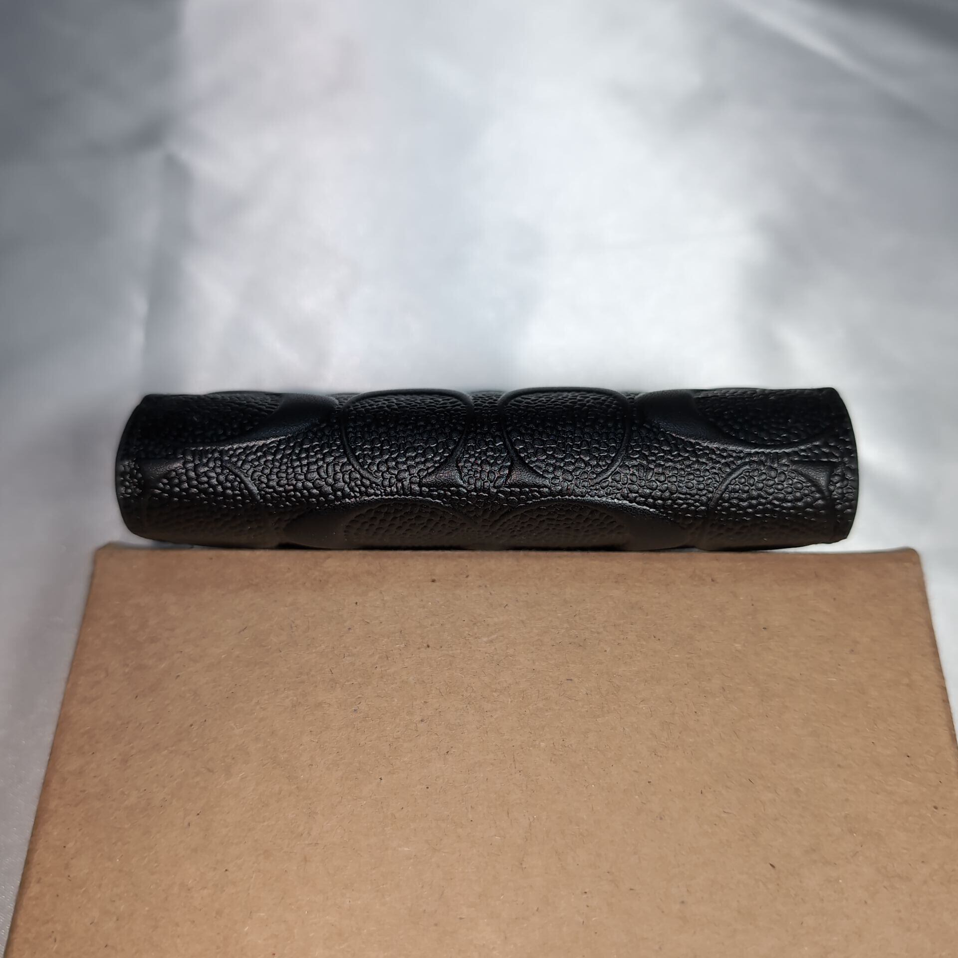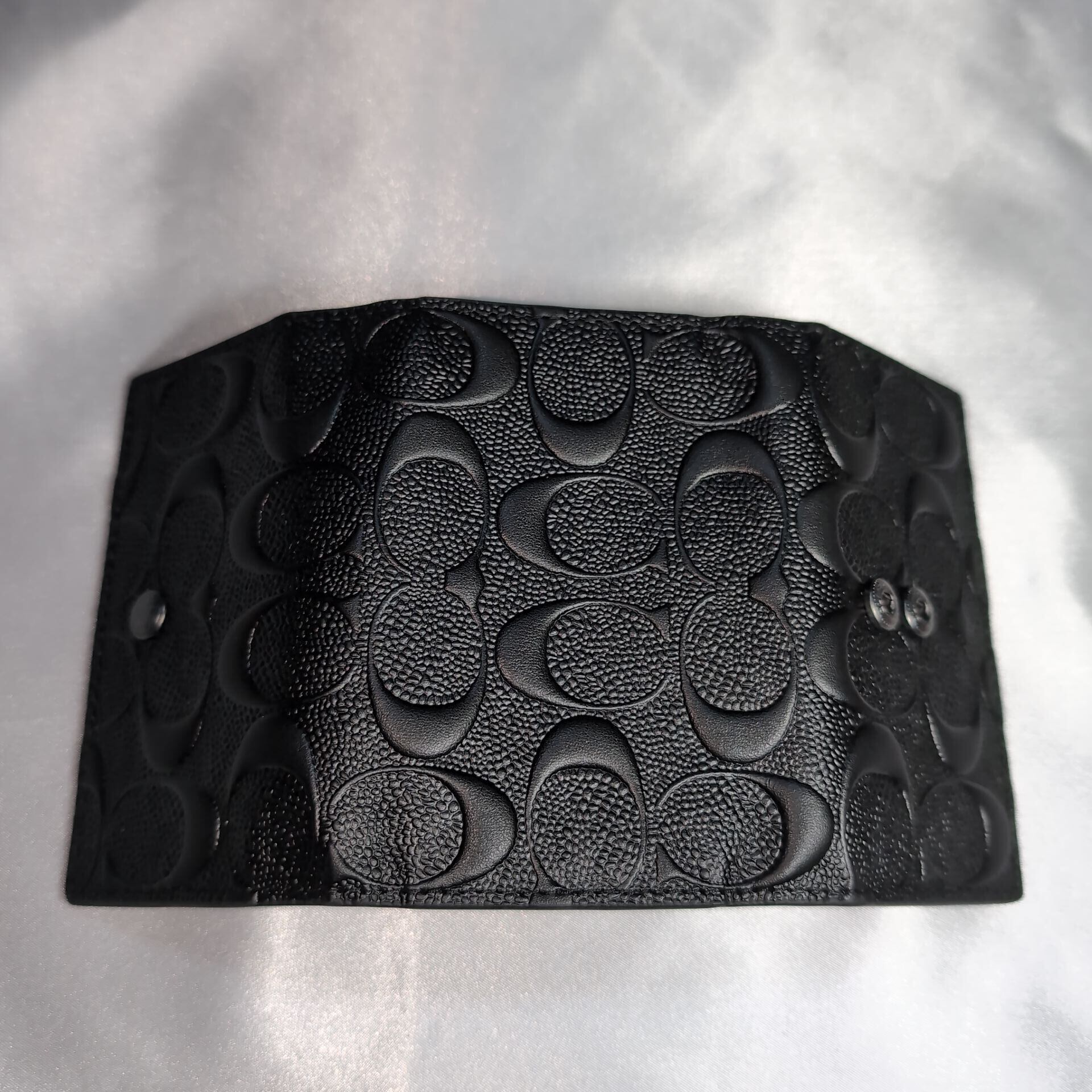 COACHのシグネチャーエンボス加工が施されており、ブラックのカラーがシンプルでありながらも高級感を演出しています。